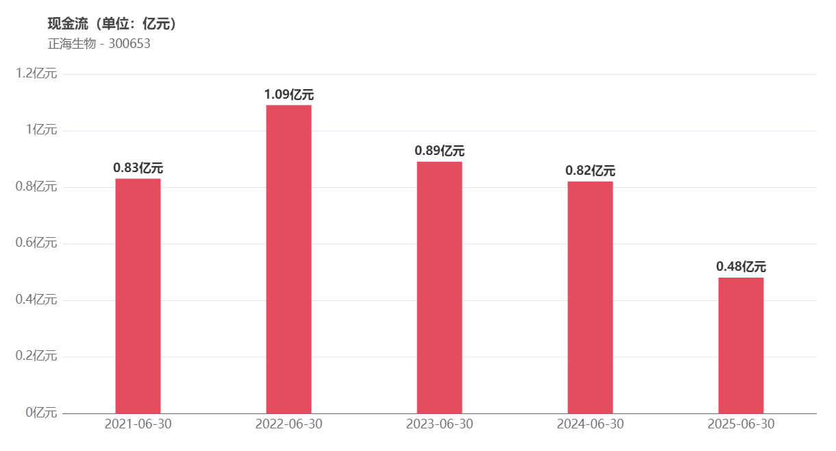 在经营稳健性方面,正海生物面临现金流承压的挑战,存货周转天数为193.17天,较2024年上半年下降了19.89%,表明库存管理有所改善。但经营活动产生的现金流净额为0.48亿元,相比2024年同期的0.82亿元,同比下滑了41.46%,显示出经营现金获取能力的减弱。此外,2025年上半年的资产负债率为9.26%,同比增长了0.42个百分点。