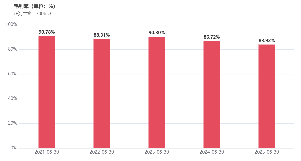 从反映盈利质量的指标来看,正海生物净利率由2024年上半年的43.45%下滑至24.75%,下降了18.70个百分点,毛利率从86.72%下滑至83.92%,净资产收益率已连续3年同期下滑。