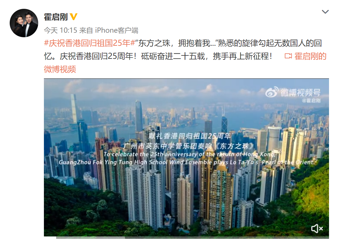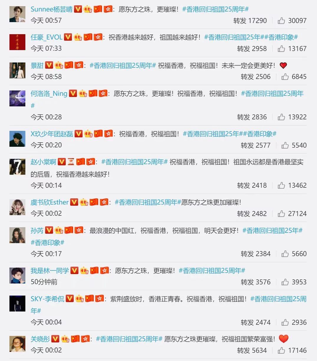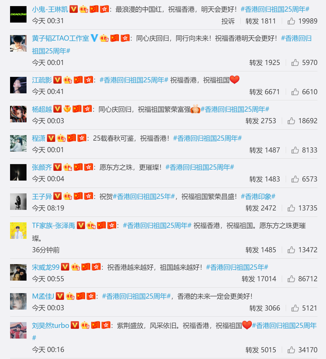 7月1日是香港回归25周年之际,全国各界都纷纷献上美好祝愿,其中也包括娱乐圈的一众明星,比如王祖蓝、twins、陈伟霆等港星代表,还有迪丽热巴、肖战、任泉等内地明星,大家分别以不同方式献上自己的祝福。
