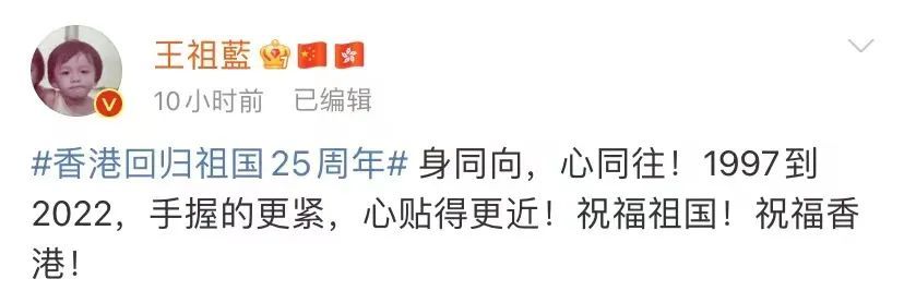 男星王祖蓝掐点准时献上祝福,他先是发文表达自己对于祖国的依恋之情,历经多年发展,香港与祖国走得更近,心也贴得更近。同时祝福祖国,祝福家乡!