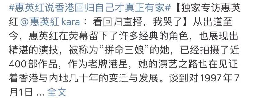 还有戏骨级人物在线祝福,比如惠英红和谭咏麟分别发文表达自己的激动心情,同时借助文字来献上自己对于祖国和家乡的美好祝愿。特别是惠英红,她不仅演技过硬,也是一位十分爱国的明星,在最近的一次采访中,她表示自己曾在观看回归直播时,激动到流泪。谭咏麟也是一样,经常参加一些公共活动,为祖国和家乡尽己所能。