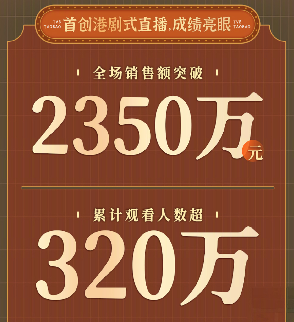 据TVB官方数据显示,这场直播累计观看人数超320万,全场销售额突破2350万,当晚登上淘宝直播间实时排行榜第二名。