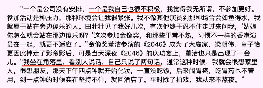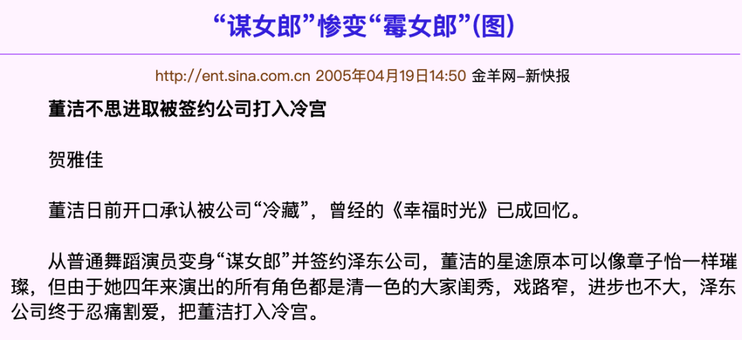 而董洁却遇到了小低谷,她因出演《2046》签了香港的泽东影视,但2005年惨被解约,解约原因不明确,董洁自称的原因是自己性格内向,不擅长社交,和香港社会格格不入,错失机会;