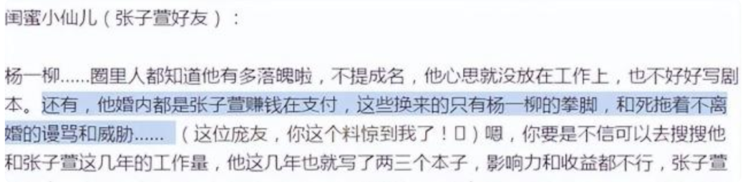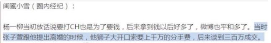 张子萱的闺蜜则出来说二人的婚姻早已名不副实,杨一柳常年没有稳定收入,全靠张子萱养家,还有暴力倾向,分手时索要天价分手费等等。