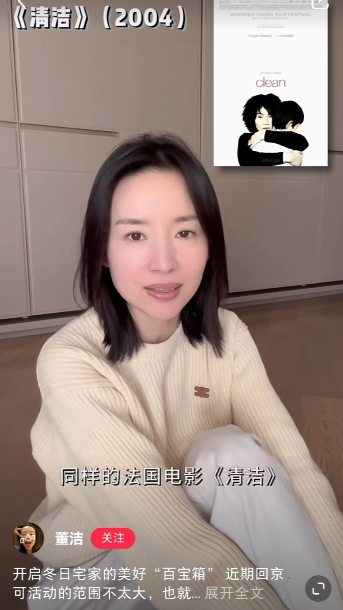除了做饭,董洁常分享穿搭,她的特点是永远不弄发型,也几乎没有妆,分享的单品大部分是小众设计师品牌,简约为主,有的贵有的便宜,但整体调性很符合她的气质,粉丝们常说冷清秋又回来了。