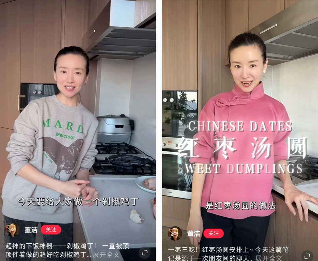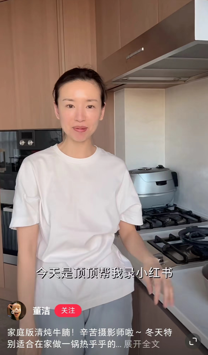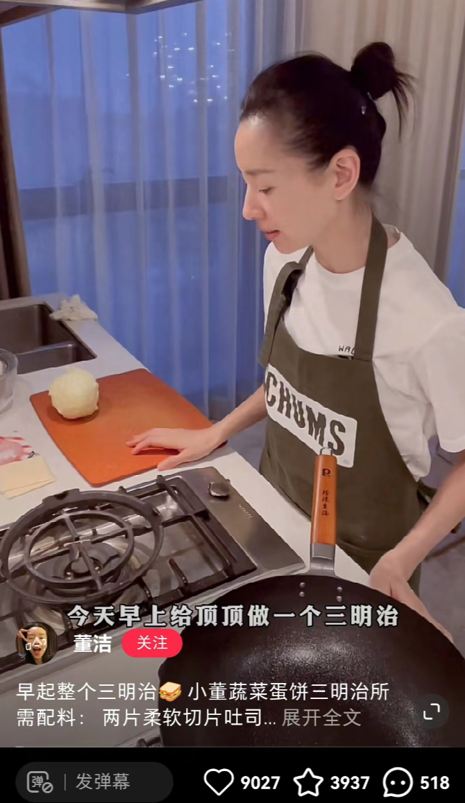 董洁的短视频内容都是和生活紧密相关的。她有一个固定栏目是做菜,画面清爽,步骤简单,菜式家常,早期也常常做烘焙、做面包,一看就是当妈妈的习惯。