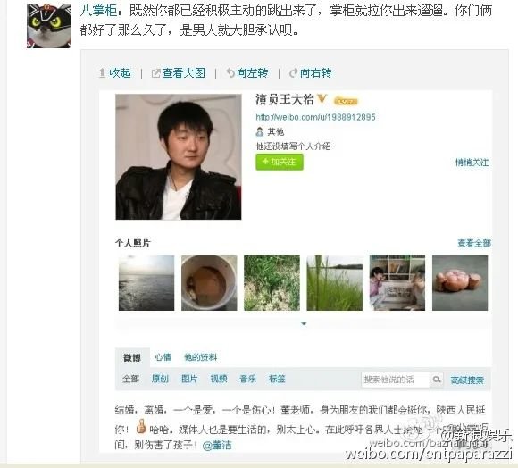 故事的另一位男主角王大治也是挺有意思的,就在董洁和潘粤明闹离婚的时候,这位先生还亲自跳出来了,在微博上力挺董洁,生怕别人不记得他似的,娱乐圈大概还没见过如此勇闯热搜的男人吧。