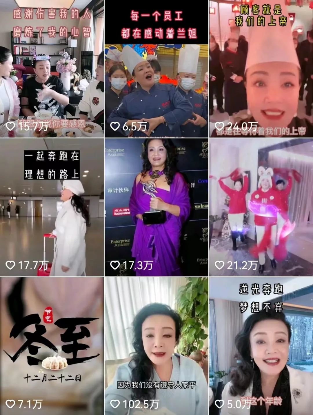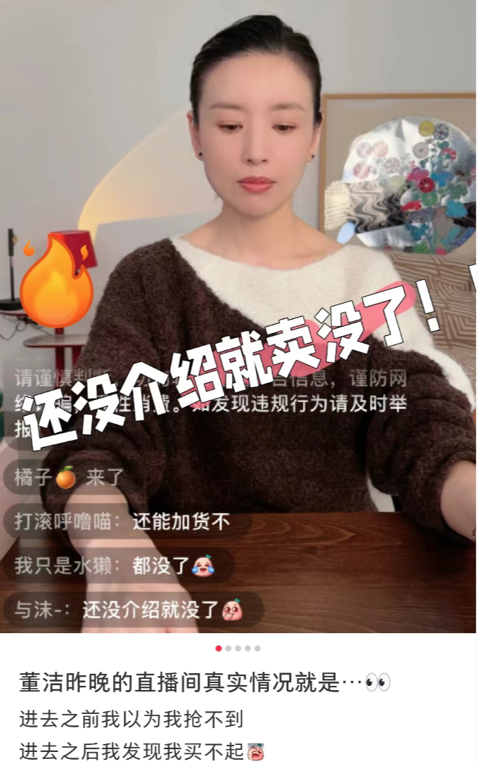 她和董洁差不多,都很会带货,也都赚了很多钱,演艺圈事业受限之后都在短视频里找到了下岗再就业的第二春,二人的区别在于她无法像董洁那样高调地直播。