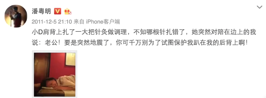 董洁生儿子没多久潘粤明就出了场车祸,董洁赶到医院不眠不休地照顾他,这事让潘粤明十分感动,在《鲁豫有约》里说,看到董洁一夜不睡,内心十分感动。
