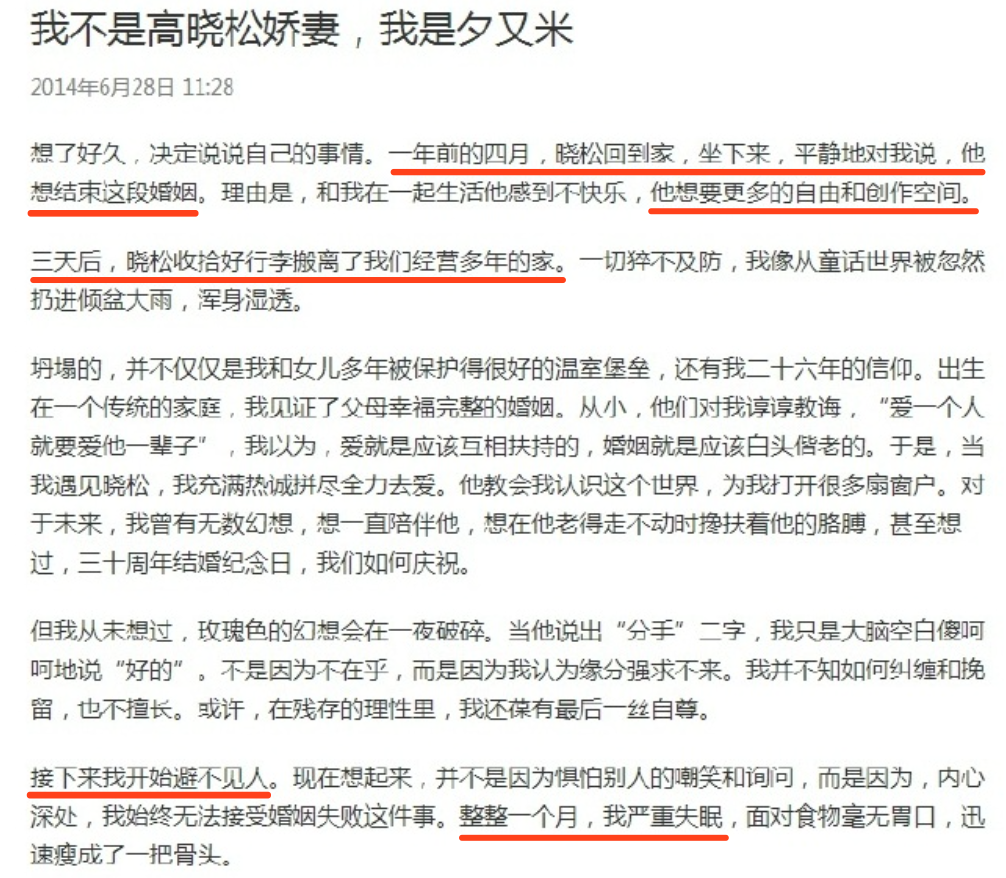 2014年6月(正是张子萱和陈赫逐渐产生爱火之时),夕又米发长文表示和高晓松离婚。