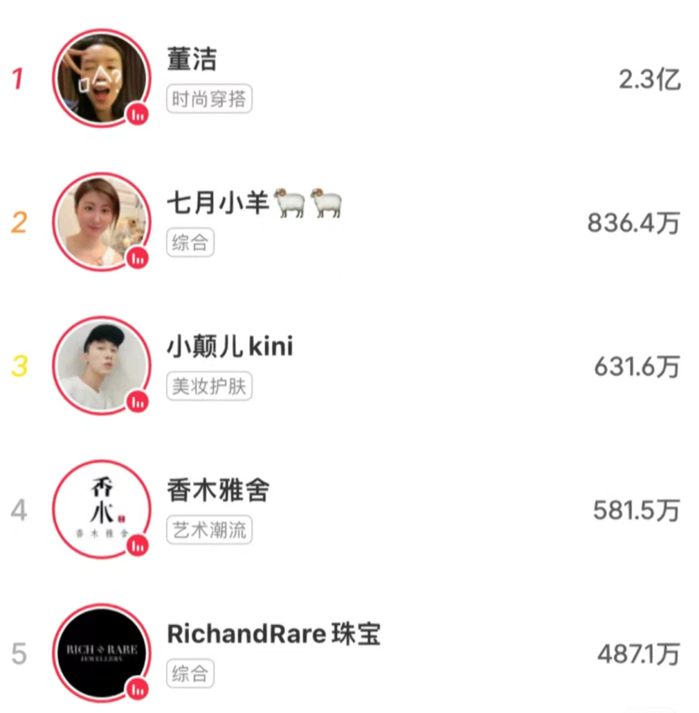 小红书的直播体量远远比不上淘抖快等平台,因此,董洁的成交额算是一骑绝尘了。