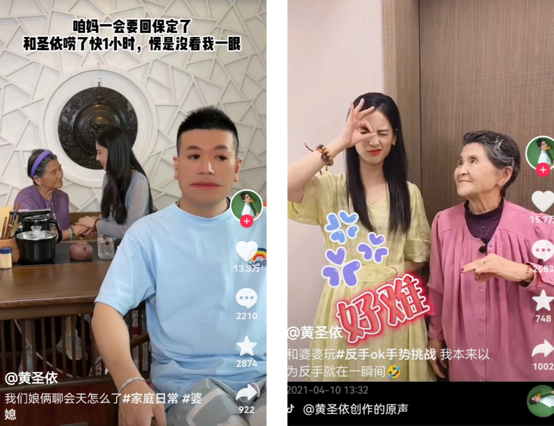 ▲黄圣依和杨子夫妻也把事业重心放在短视频上,关于婆媳关系,夫妻关系的内容都是他们的拍摄重点。