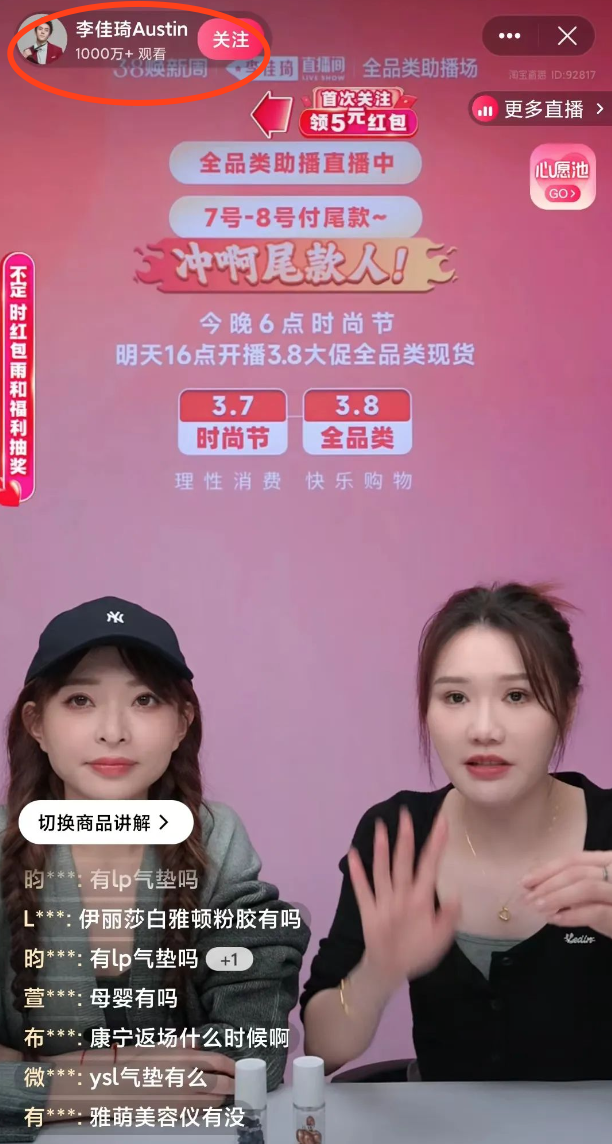 ▲虽然依然是最头部的主播,但整个三八节,李佳琦出现的频率很少,大部分时间都是助播坐在那里卖货。因此可以推测,李佳琦以及其身后的美one公司已经决心要“去李佳琦化”,李佳琦将慢慢退隐,培养更多素人主播上位。