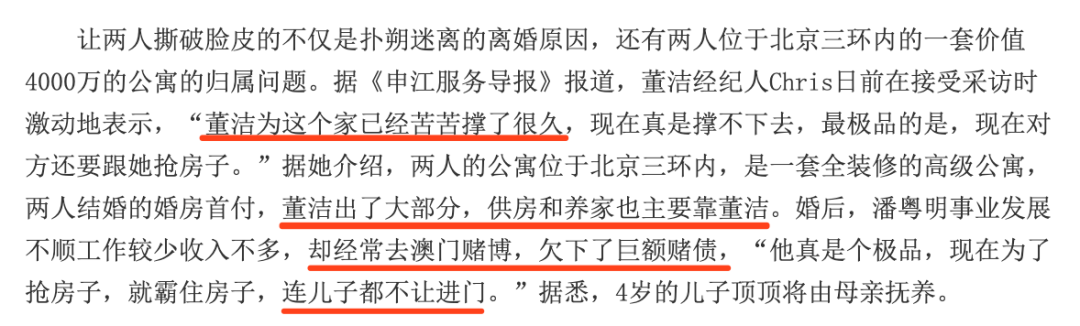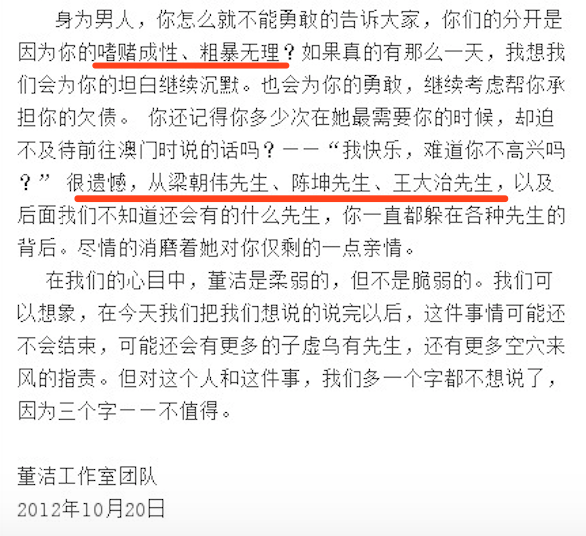 婚变传闻愈演愈烈,董洁这边率先回应,由经纪人出面解释婚变真相,指责潘粤明烂赌、霸占房子,婚后全靠董洁养家等等,又说和梁朝伟、王大治的绯闻全都是潘粤明凭空捏造。