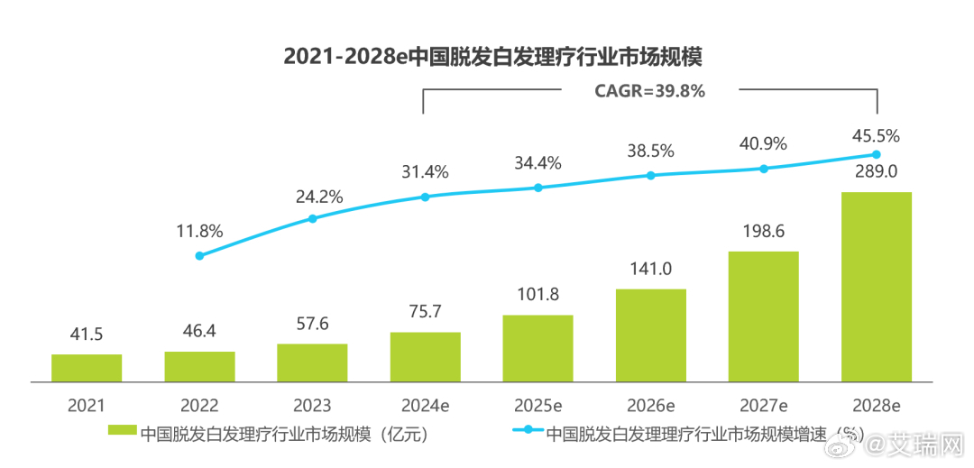 【艾瑞数据】根据卫健委公布的数据,中国脱发人群数量已超过2.5亿,即每6人中就大约有1人面临脱发的困扰。与此同时,白发问题也日益凸显,特别是在35至40岁的人群中尤为显著。脱发和白发问题长期存在,但随着市场对改善脱发白发方案的普及教育不断加深,相关的理疗机构在各方面能力上也在持续升级,预示着脱发白发理疗市场将迎来巨大的增长潜力。在2021年至2023年期间,受到疫情影响,民众到店进行理疗的意愿不高,脱发白发理疗市场的增长相对缓慢。从2024年开始,随着经济的逐步恢复,以及人们对个人形象重视程度的提升,结合理疗服务技术的更新迭代和产品升级,选择理疗服务的人群渗透率将不断上升。越来越多的脱发白发人群将倾向于选择理疗作为解决方案,从而推动整体市场规模的爆发式增长。预计至2025年,脱发白发理疗市场的规模将突破百亿大关,而到了2028年,市场规模有望进一步攀升至289.0亿元,展现出强劲的增长势头。
