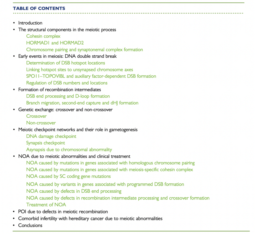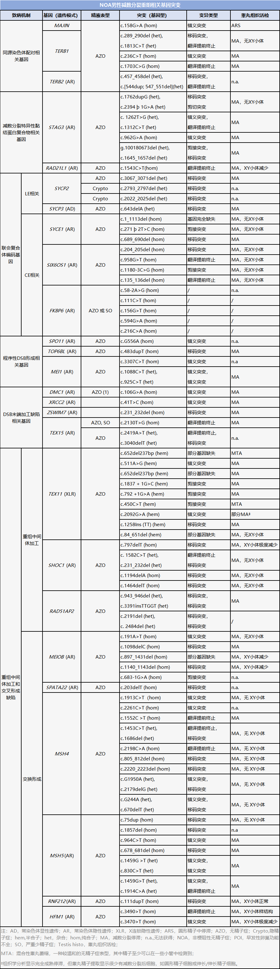 NOA主要由减数分裂基因突变引起,文章总结了26个基因导致人类NOA的基因。鉴定与减数分裂重组相关的致病基因不仅有助于临床医生的诊断,而且为不孕症患者的最终治疗提供了一个精确的靶点。