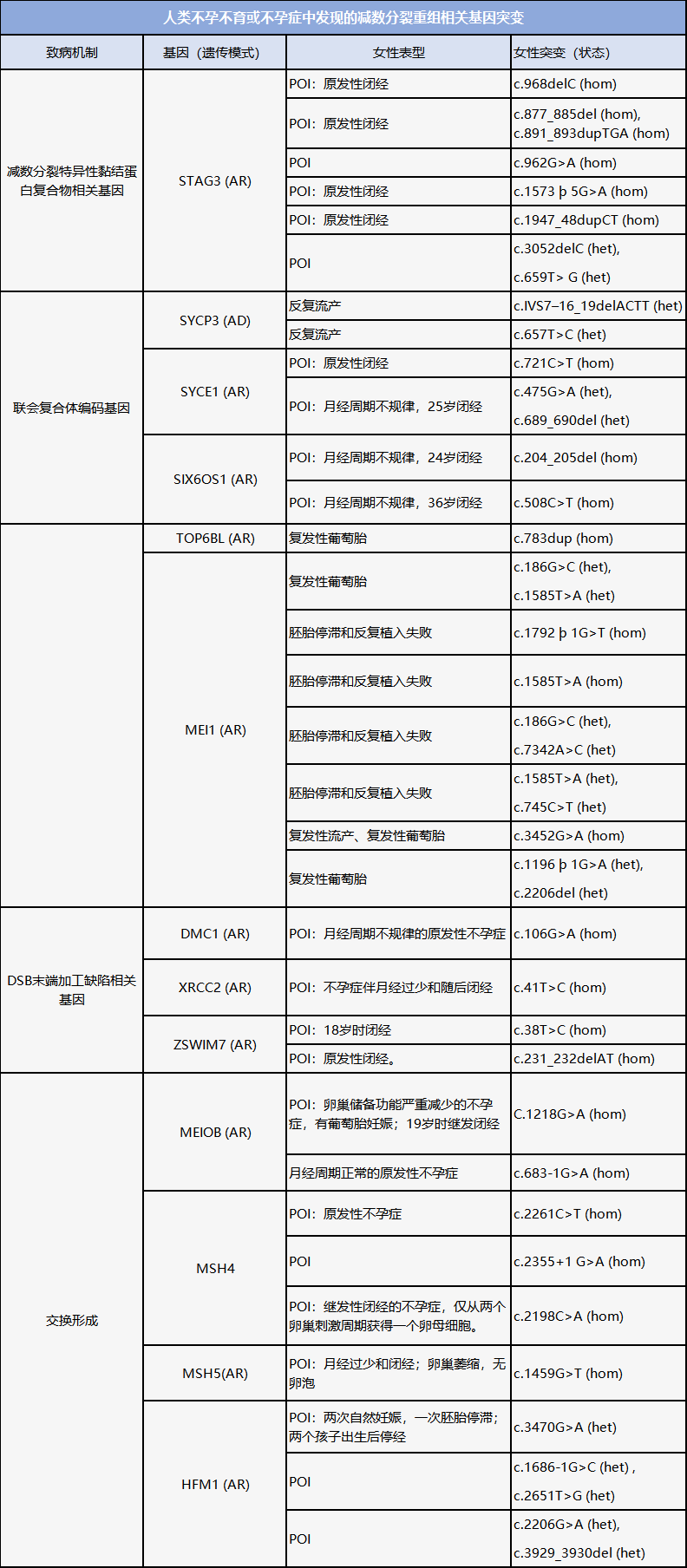 减数分裂重组在精子发生和卵子发生中的过程本质上是相同的,许多导致NOA的减数分裂相关基因也会造成POI(见下表)。因此,NOA患者一旦鉴定出了此类基因缺陷,则有必要对女性家庭成员进行相关基因筛查。此外,减数分裂重组中的变异与卵泡池的早期或后期消耗有关。当在女性中检测到NOA相关基因突变时,临床医生应与之讨论POI或卵巢功能障碍的风险,并尽早帮助其做出有关生育能力保存或妊娠的决定。