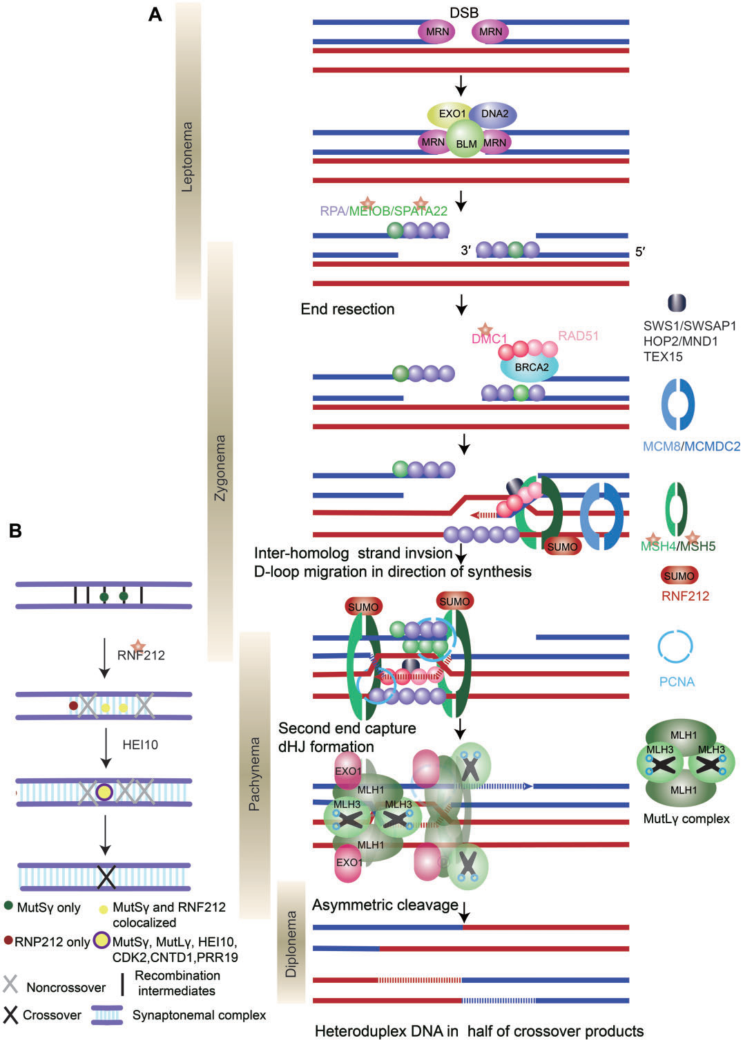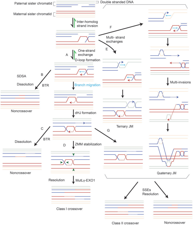 dHJ中间体可以通过dissolution或resolution两种方式进行解开,如果dHJ通过dissolution方式解开则会产生非交换产物,如果以resolution方式解开则可形成交换或非交换产物。交换产物的形成使得同源染色体在双线期形成交叉,但是DSB大多数是以非交换形式进行修复的。交换有两类,即由MutLγ蛋白切割dHJ结构而产生的第一类交换和由结构选择性内切酶Mus81-Eme1、SLX1-SLX4/BTBD12和GEN1切割重组中间体所产生的第二类交换;第一类交换是减数分裂同源染色体发生遗传物质重组的主要方式。