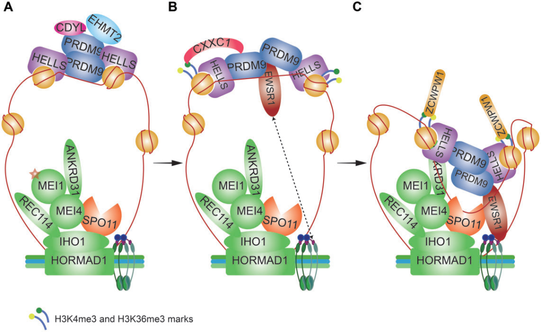 减数分裂重组起始于程序性DSB。DSB位点并非随机分布,而是定位于由组蛋白3甲基化标记(H3K4me3和H3K36me3)的染色质环上的热点区域,这一过程经由PRDM9催化 。