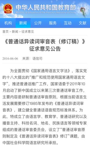 1985年,国家发布《普通话异读词审音表》,对一些异读词进行了修订。2016发布的《征求意见稿》又对一些读音进行了新的修订,并发布在教育部网站上征求意见。
