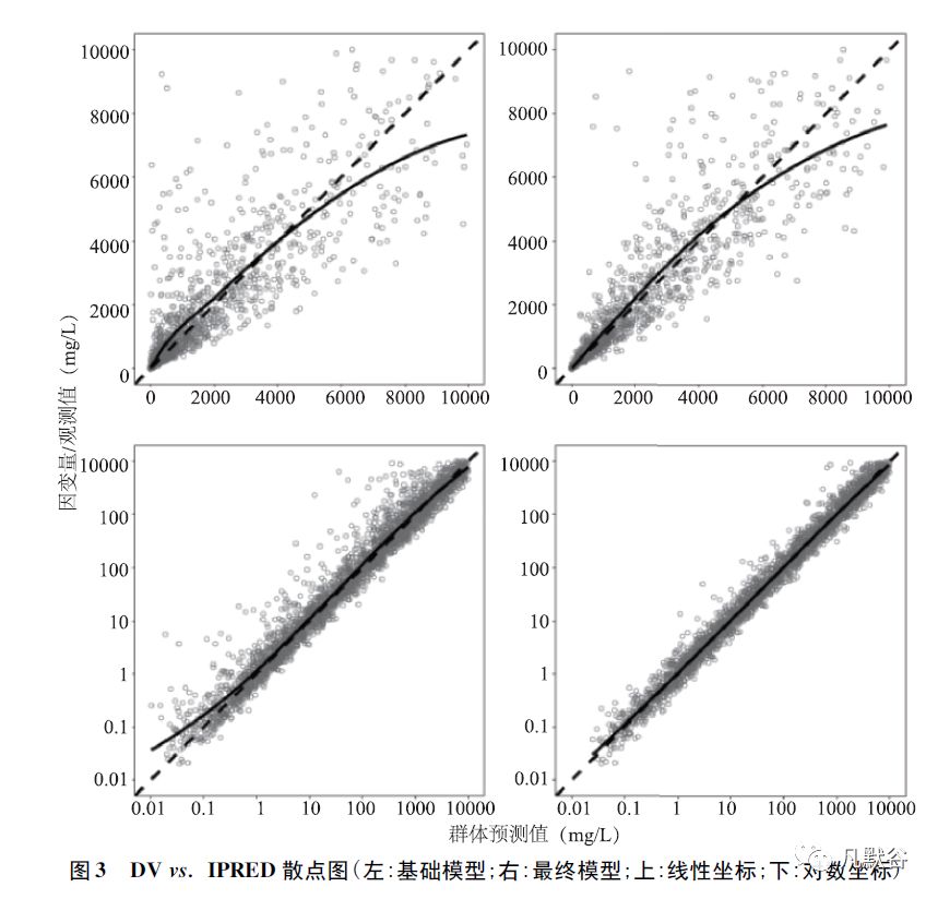 (6) 结果: 一般包括结构模型、协变量筛选过程中的关键步骤和评价,最终模型的形式,最终模型的参数估计值以及变异(CV%)、精度(RSE%、95%CI),模型的评价,模拟或其他应用(如重要协变量对PK 暴露的影响、剂量的调整等)。