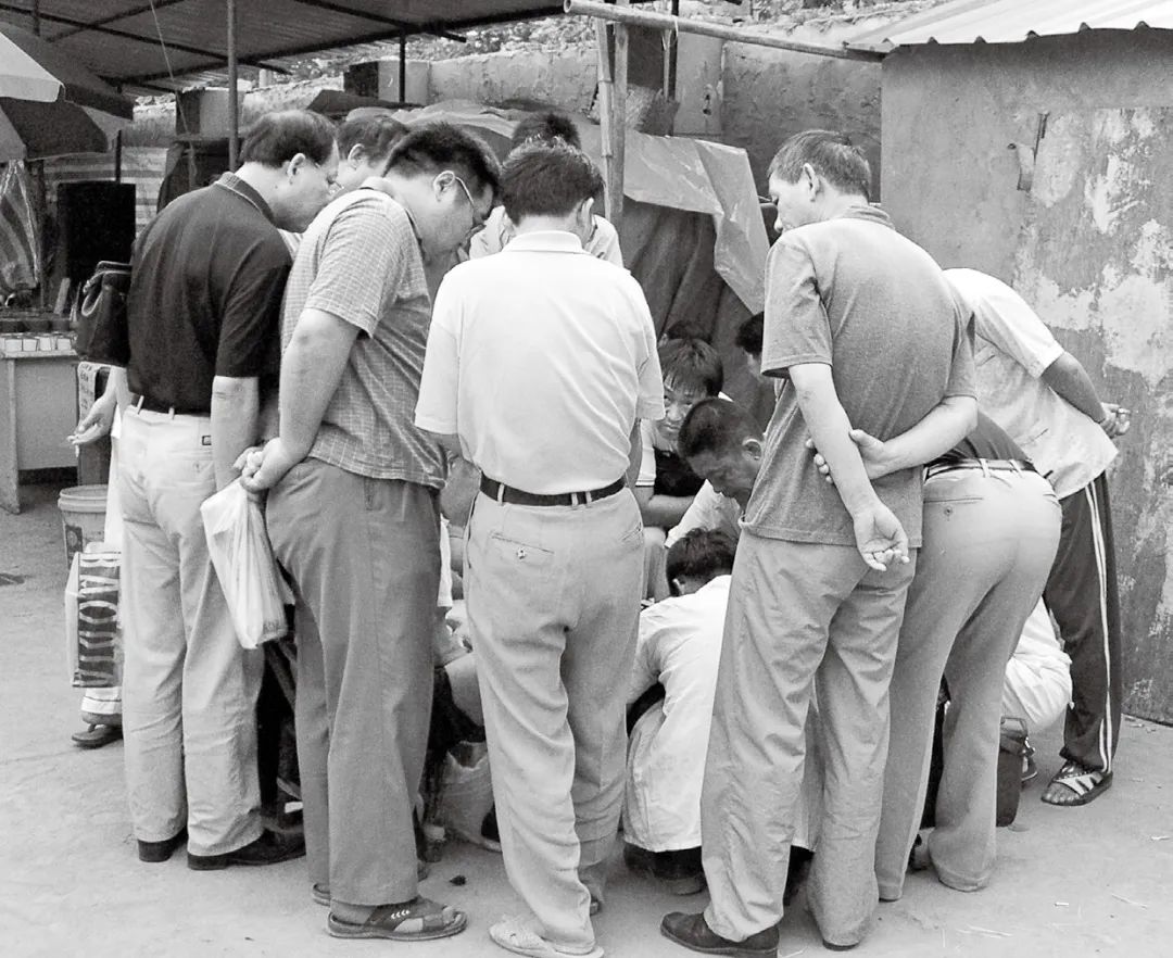 热衷于斗蟋蟀的人们在观看“蟋蟀大战”。