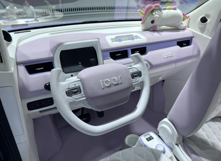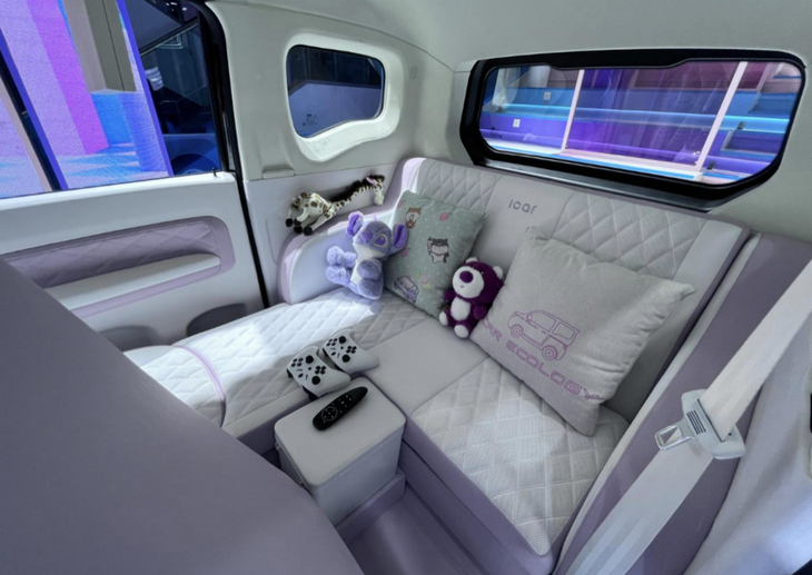 内饰设计上,新车整体使用浅色为主色调,和车身颜色相呼应。并将采用了一款改装后的方向盘。当然为了满足宝妈的使用场景。前排副驾驶座椅倒坐,与后排座椅拼接成一个沙发榻,并有独立的小桌子,可以与儿童进行友好的互动。车内还有玩偶,游戏手柄等装饰件。