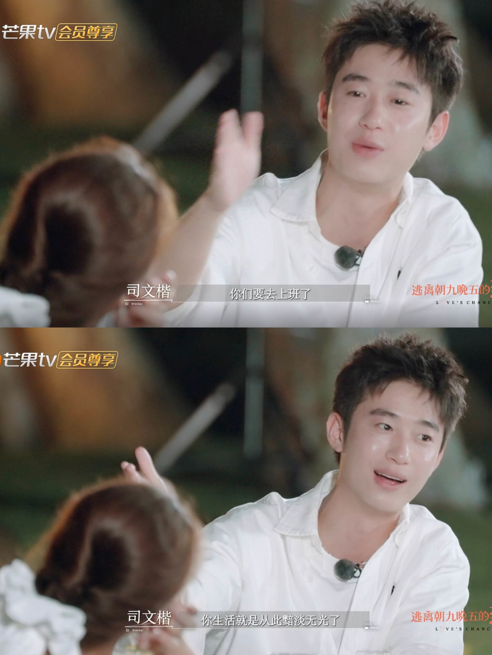 在第六期最后的沙滩聚餐时,大家正在感伤地谈论生活和未来。司文楷一句嘴瓢“明天上班”也在此刻达到杀伤力的巅峰,直接吓得程嘉鼎蹦起来,连连哄自己:“明儿不上班啊,我再提醒你一下,后天。”