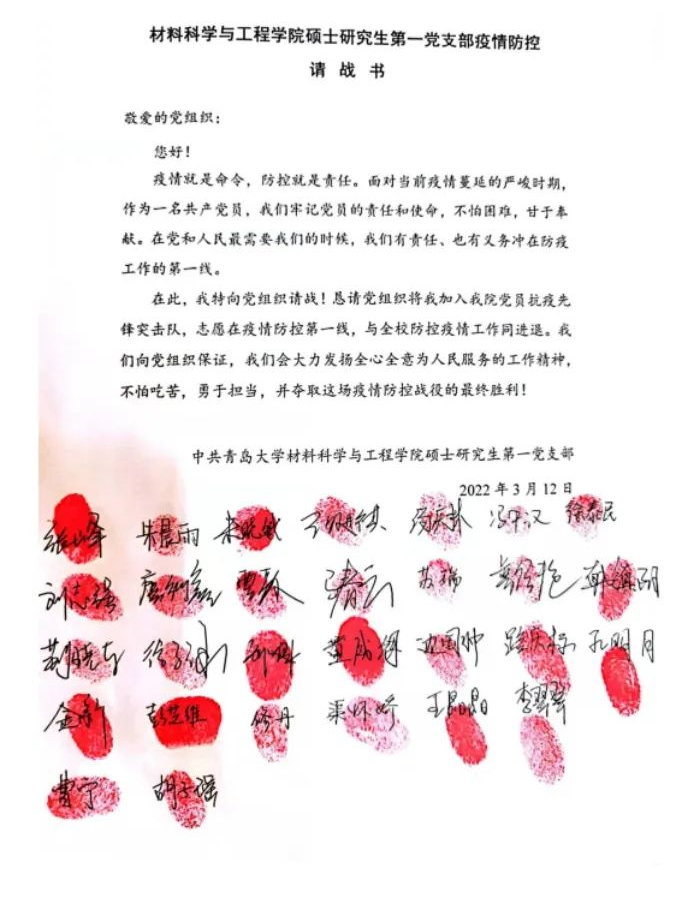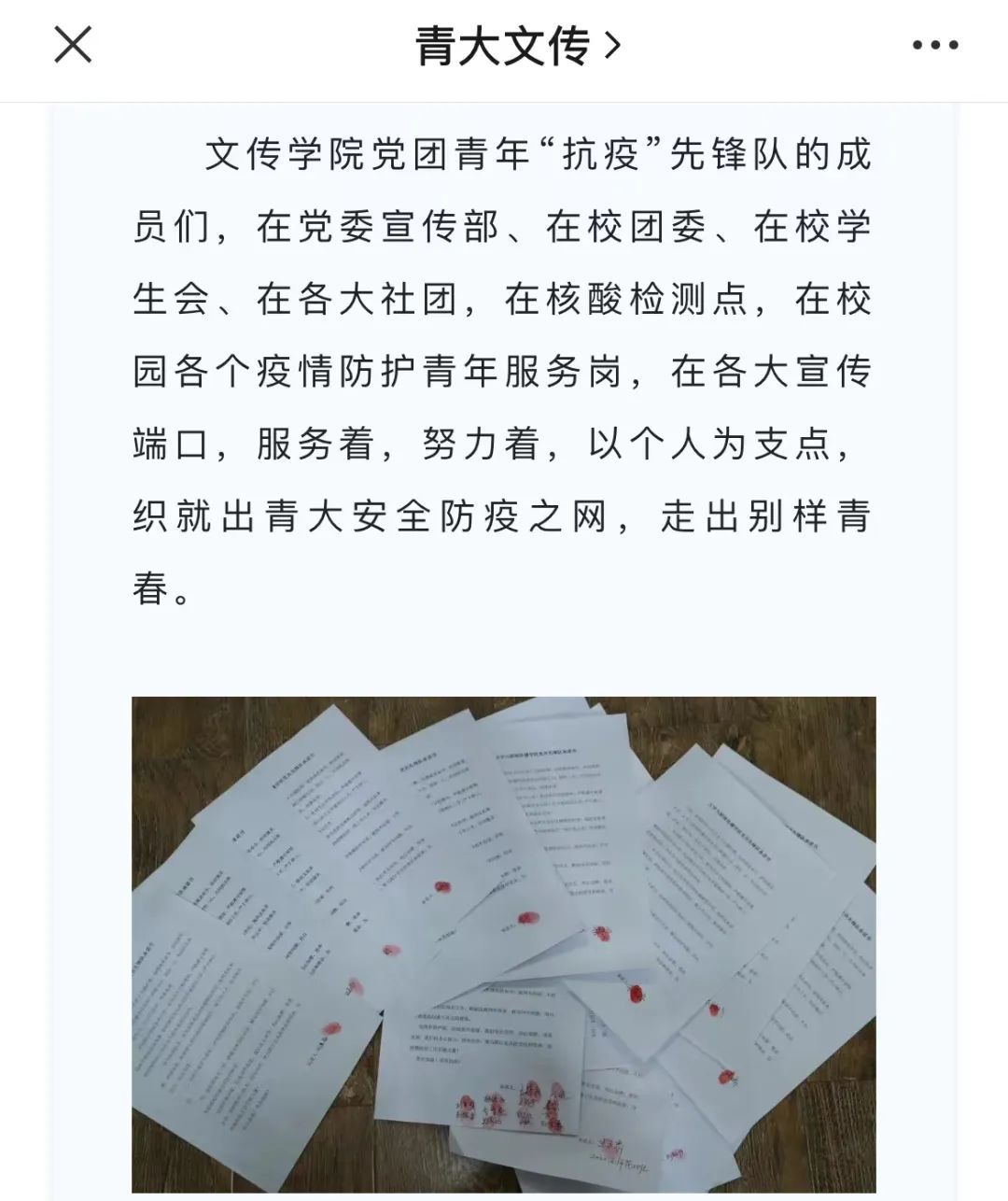 ……大家争先恐后把辅导员围在中间,你一言我一语,急切的话语让她热泪盈眶,她知道,这是青大的血液,也是战疫的生力军。请战书上的一个个红色手印,像火苗般温暖着她和每个人的心,陆陆续续,这些红色血液流淌在校园每个角落,他们穿上防护服,套上红/蓝马甲,扛起猎猎红旗,活跃在每个工作现场,叮嘱同学们戴好口罩、保持一米线、三米线,一句句“青大加油”是浮山脚下最动听的诗歌。人心齐泰山移,大家自觉拧成一股绳,发挥战斗堡垒的最强力量,党旗所指,心之所向,同心同德,勇于担当,我们的胜利就在前方。