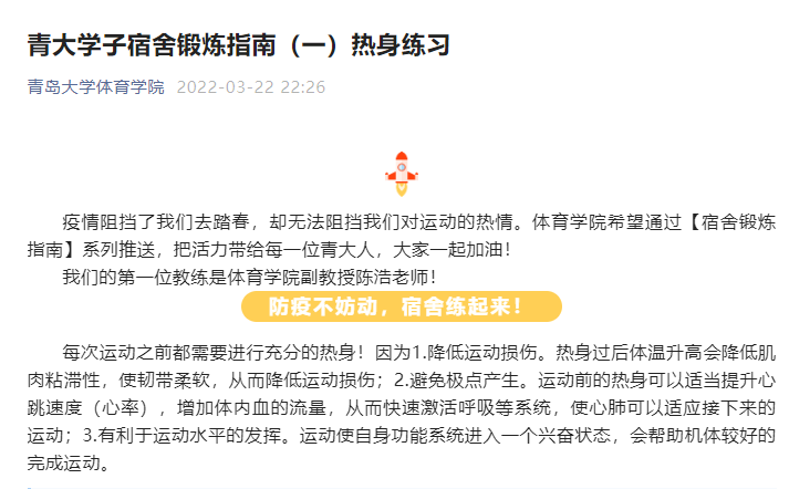 不用早起做早餐、下班买菜做晚饭,这一个多周一日三餐都在食堂,他比平时省出了饭前饭后的时间和精力。随着形势缓和,春天的微风吹在脸上也能感受到一丝惬意,闭上眼睛憧憬着迎着石老人的海风,踩着八大关的落叶,逗着栈桥的海鸥,走在青岛的大街小巷,感受春秋冬夏轮转的美好时光,篮球就滚到了脚边,看着操场上的篮球小子,感慨着,青春的活力果然是封不住的,运动也可以让心灵更健康。但是操场上的运动密度显然大不如前,“健步走”!把那些跃跃欲试的学生们先拉出来,与老师们一起边走边聊;浮山公寓运动场地不足,这也不难,“宿舍虽小,运动也够”——咱学校可是综合类高校,校健美操队的同学们提供宿舍运动“独门秘方”,他也偷偷在宿舍练习,约好了跟学生们比比看谁的动作更标准;体育学院国家级健将录制易学易练的运动视频,指导大家就地动起来;手眼运动也是运动,学生谦虚地说自己四肢不协调,那就画!创造“美”,每个人都有自己的本领。他编了朗朗上口的一段,在学生中广为流传——“gogogo,偶遇与邂逅;hihihi,运动更可爱;drawdrawdraw,作品拍个照!”