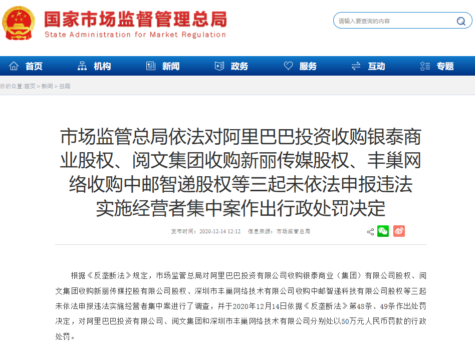 12月14日,国家市场监管总局通告称,根据《反垄断法》规定,市场监管总局对阿里巴巴投资有限公司收购银泰商业(集团)有限公司股权、阅文集团收购新丽传媒控股有限公司股权、深圳市丰巢网络技术有限公司收购中邮智递科技有限公司股权等三起未依法申报违法实施经营者集中案进行了调查,并于2020年12月14日依据《反垄断法》第48条、49条作出处罚决定,对阿里巴巴投资有限公司、阅文集团和深圳市丰巢网络技术有限公司分别处以50万元人民币罚款的行政处罚。