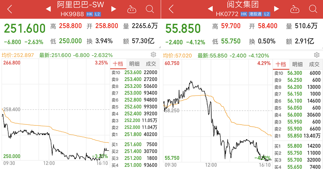 受相关消息影响,阿里巴巴盘中一度跌逾3%,截至收盘,阿里巴巴下跌2.63%,阅文集团大跌4.12%。