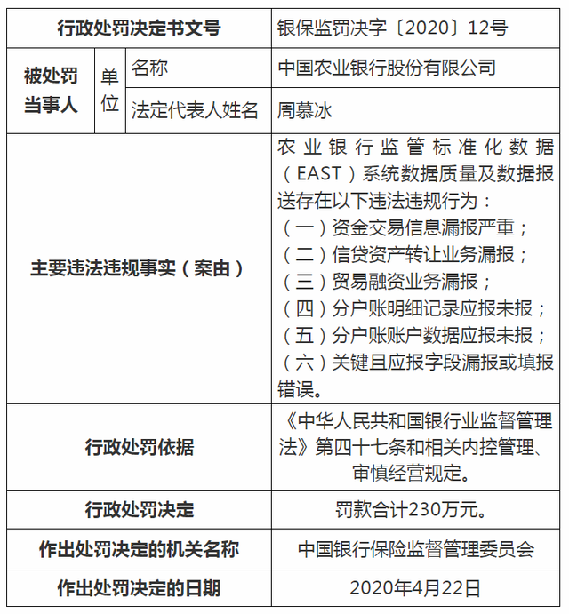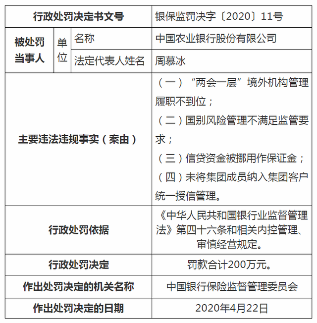 中国农业银行股份有限公司收到两份行政处罚决定,在银保监罚决字〔2020〕11号文件中显示其主要违法违规事实(案由)有: