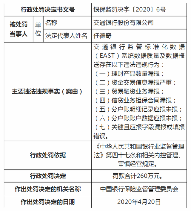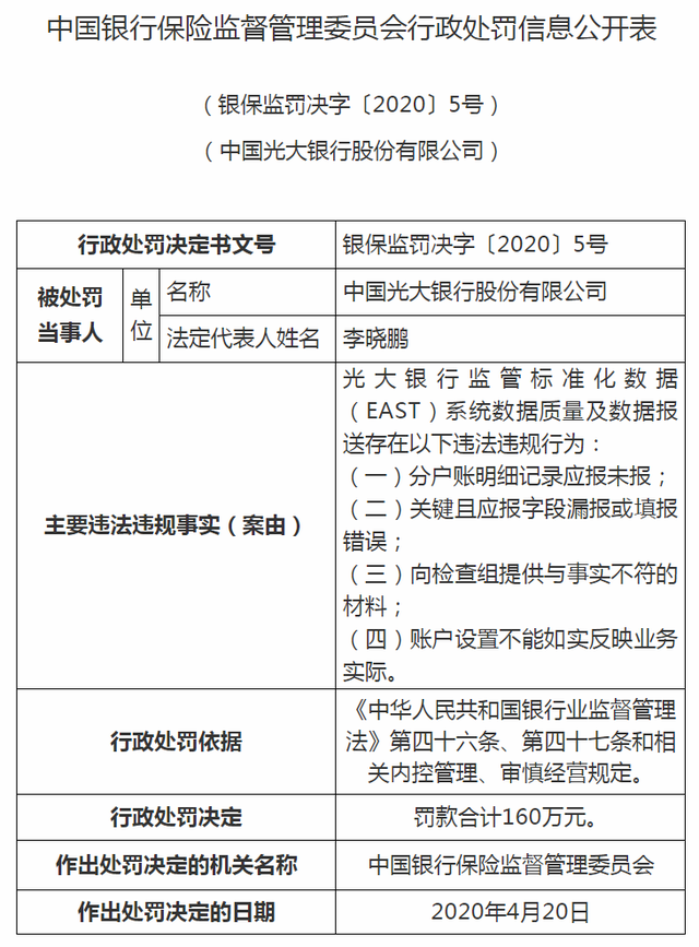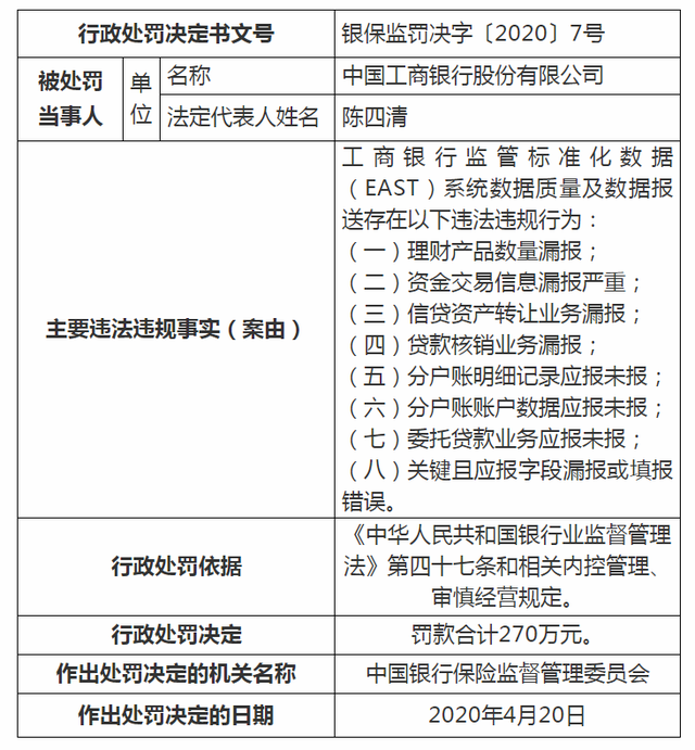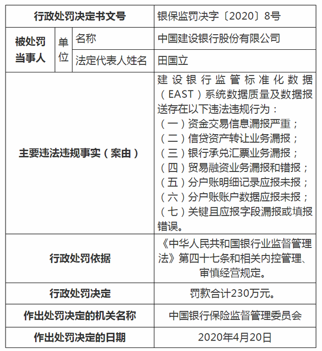 导读:5月9日,银保监会公布行政处罚信息公开表显示,包括国有六大行在内的8家银行,因监管标准化数据(EAST)系统数据质量及报送存在违法违规行为受罚,罚款金额共1770万元。