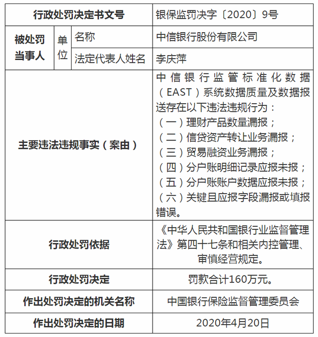 中信银行监管标准化数据(EAST)系统数据质量及数据报送存在以下违法违规行为: