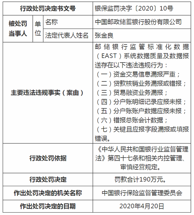 邮储银行监管标准化数据(EAST)系统数据质量及数据报送存在以下违法违规行为: