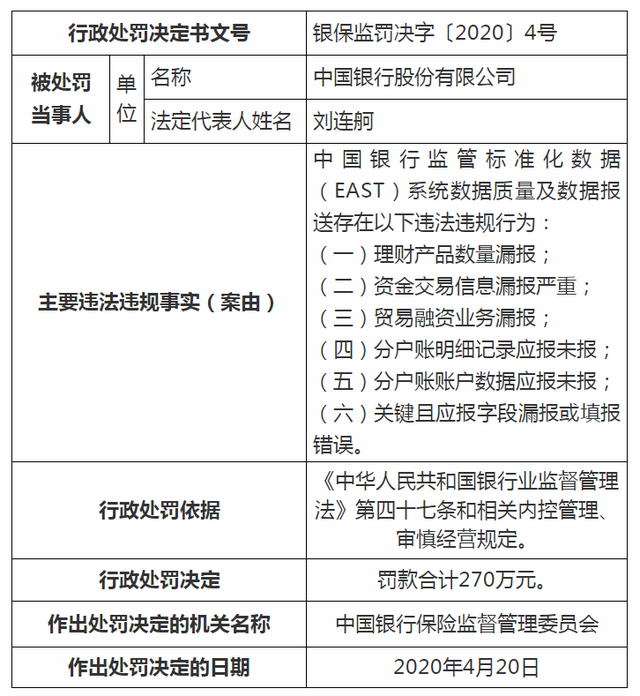 中国银行保险监督管理委员会行政处罚信息公开表显示,中国银行股份有限公司因存在以下行为,被罚款合计270万元。