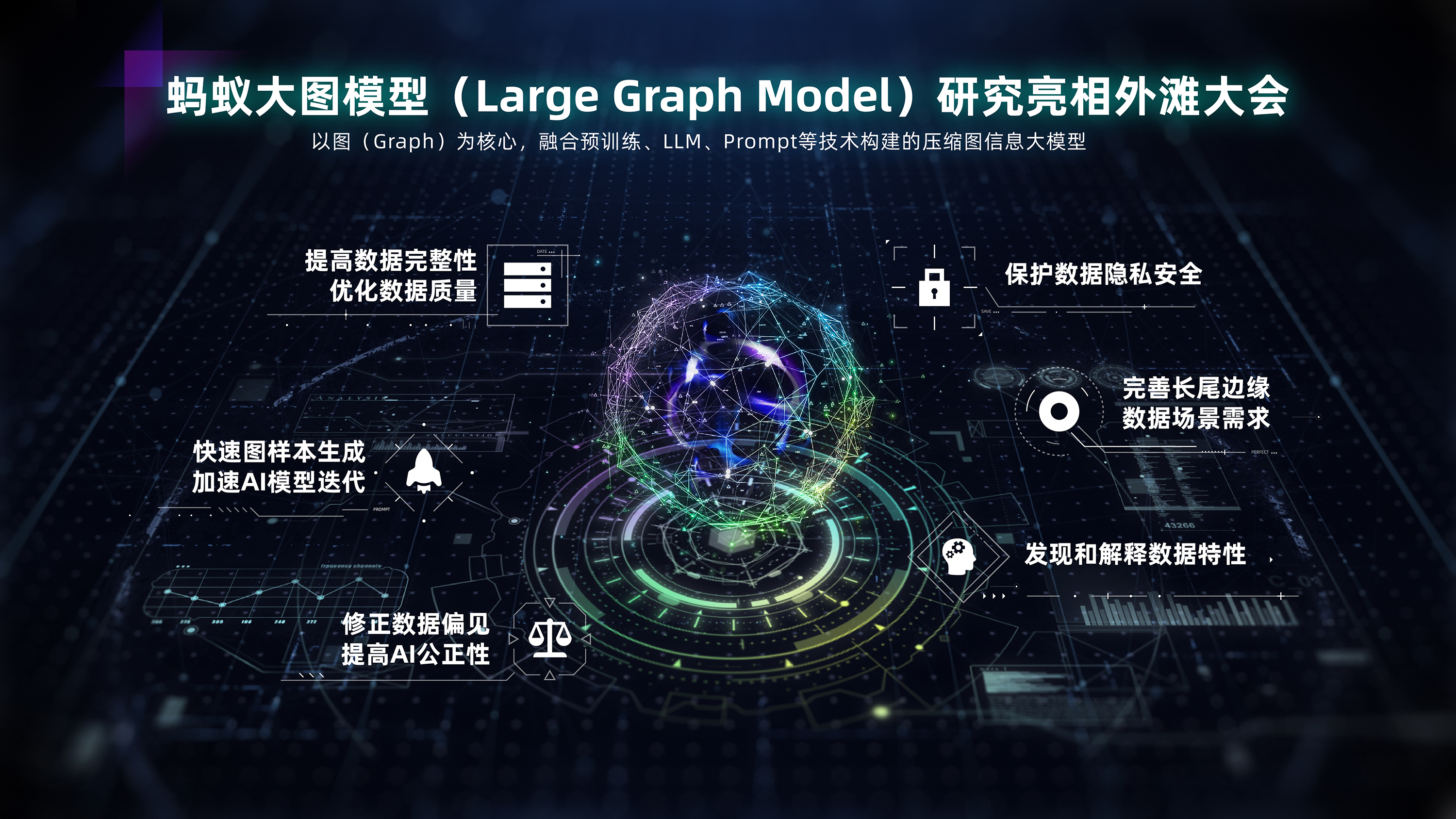 在这项研究中,蚂蚁集团主要开展了两项工作。 第一,利用大语言模型丰富图数据。区别于普通的上下文依赖模型,大语言模型可以根据现有数据生成新的数据点。这项工作名为 “生成式异质图增强”工作,即通过大语言模型来扩展和丰富不同类型的图数据。第二,通过Prompt(一种指令或提示)引导模型学习和发现特定数据特性。例如,设置一个 Prompt“一年内违约3次以上的群体的共同特征”,模型便会生成满足特定条件的数据样本。这种能力可以加速数据分析和特性发现的过程。