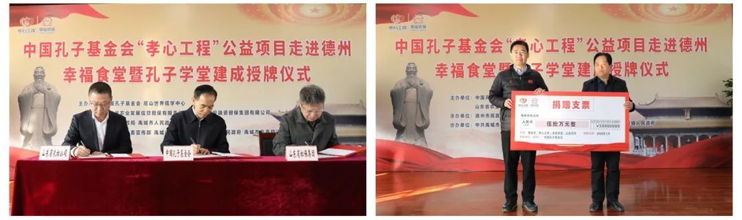 本次建成授牌的辛店镇、辛寨镇幸福食堂由山东农担公司和省担保集团共同出资资助建设。在现场举行的捐赠仪式上,山东农担公司、省担保集团与中国孔子基金会签订了捐赠协议,中国孔子基金会向禹城市民政局递交了捐赠支票。