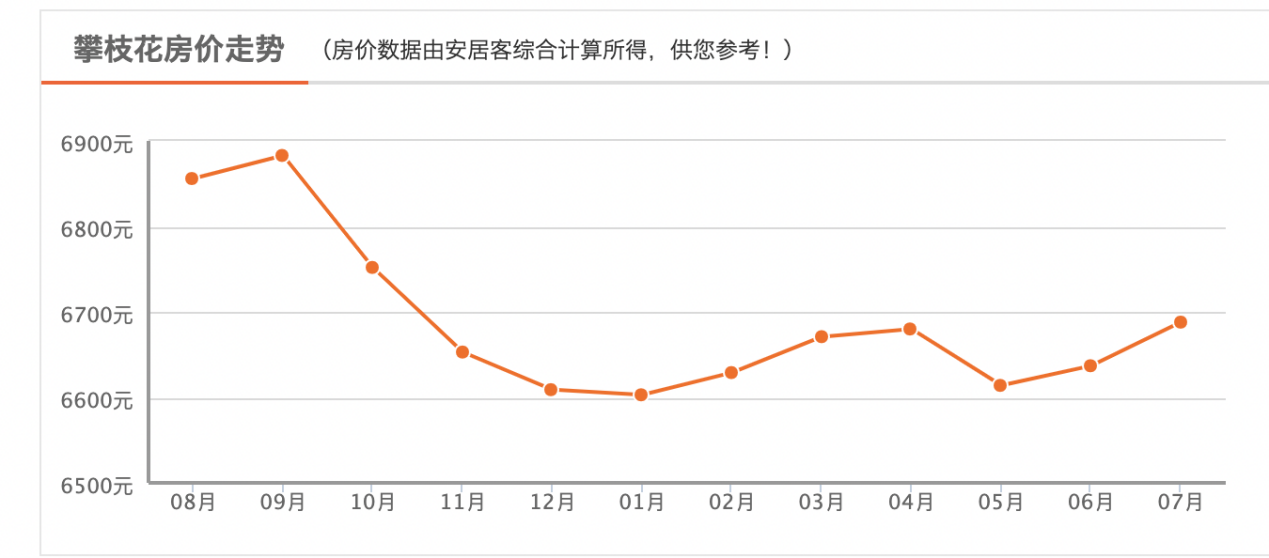 安居客数据显示,7月份攀枝花的新房均价为每平方米6688元,过去的一年里,新房均价从未突破6900元的天花板。