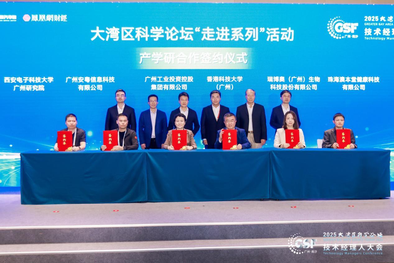 随后,“走进系列”活动对接成功案例在大会现场进行合作签约——广州工业投资控股集团有限公司、香港科技大学(广州)、广州安粤信息科技有限公司、西安电子科技大学广州研究院、瑞博奥(广州)生物科技股份有限公司、珠海澳本堂健康科技有限公司等6家单位代表完成签约,生动诠释了大湾区成果转化“真对接、真落地”的生态优势。