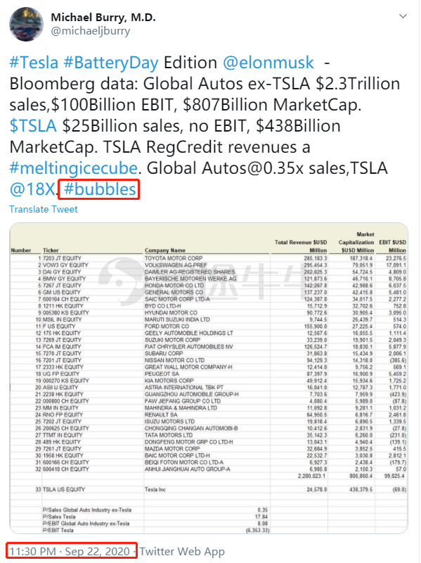 早在9月22日,Michael Burry就已经发布了一条推特,剑指特斯拉。他@了马斯克,还关联了“电池日”、“泡沫”等话题标签......