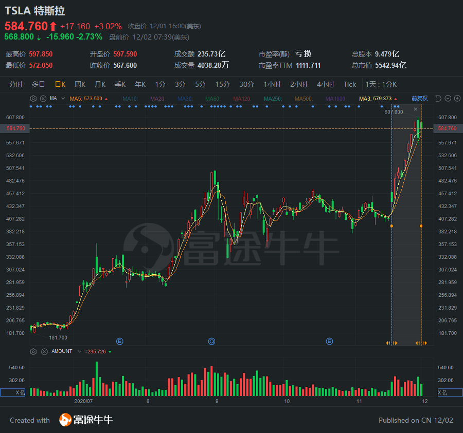 11月16日美股盘后,标准普尔道琼斯指数公司宣布特斯拉将在12月21日(周一)盘前纳入标普500指数。在宣布该消息后至今,特斯拉股价飙涨43%,市值攀升至逾5500亿美元。