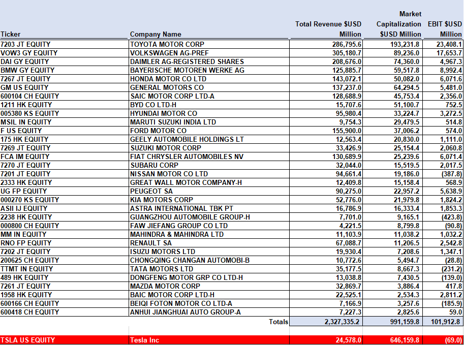 在这条推文中,Micheal Burry还配以一张图片,比较世界上汽车公司在营收、市值、EBIT三个维度的数据。