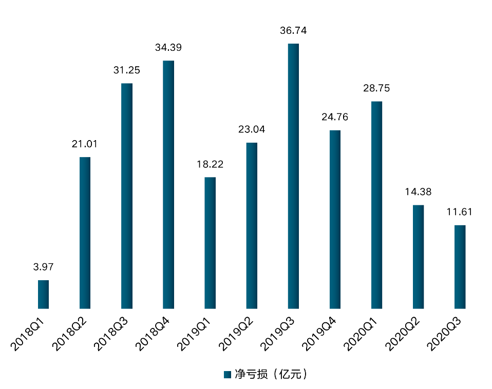 爱奇艺2018年第一季度至2020年第三季度各季度单季净亏损数额
