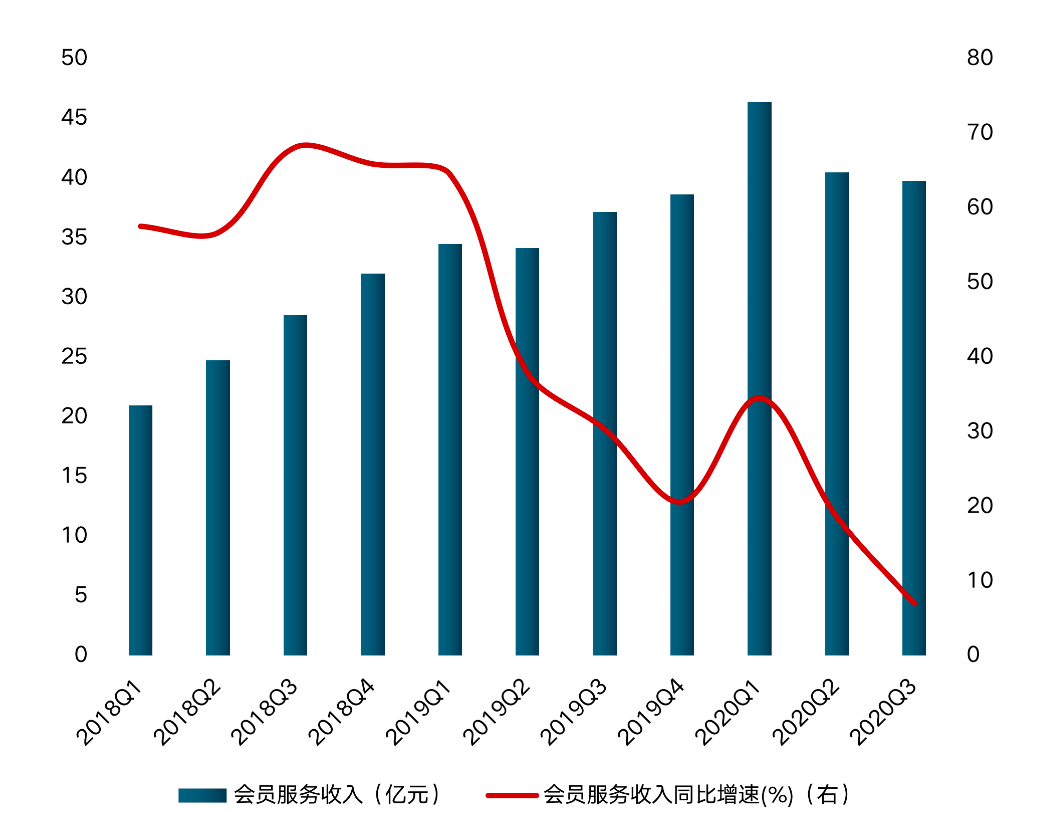 值得关注的是,《投资时报》研究员留意到,若以各季度单季业绩数据为分析基准,自该公司上市至今,其会员服务收入同比增速整体处于下降通道,已由2018年一季度单季的57.52%下滑至2020年三季度单季的6.96%。可以说,从同比表现来看,该公司会员服务业务创收的空间已经收窄。