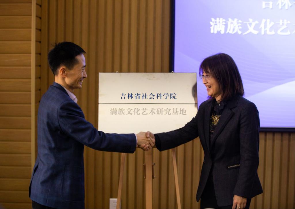 仪式上,吉林省社会科学院丁晓燕副院长与长春光华学院康启鹏董事长共同为“吉林省社会科学院满族文化艺术研究基地”揭牌。与会专家、领导及相关人员进行了合影留念并到长春光华学院满族艺术研究所创研基地走访参观。