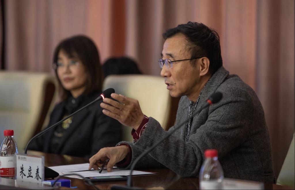 随后,吉林省社会科学院民族研究所所长朱立春在讲话中表示,国家一直强调要提高文化软实力,虽然东北三省的文化资源非常丰厚,但民众对其认知度较低,学校可以从艺术角度进行呈现,推动我省文化产业的发展,并且非遗进高校是国家保护非物质文化遗产的一种途经;在今后的合作当中,吉林省社科学院民族研究所将给予大力支持,充分利用我省各项资源,利用文化元素促进艺术生产和熔炼,期间并对电影学院排演的《记住老黑河》原创话剧给予了高度的评价。