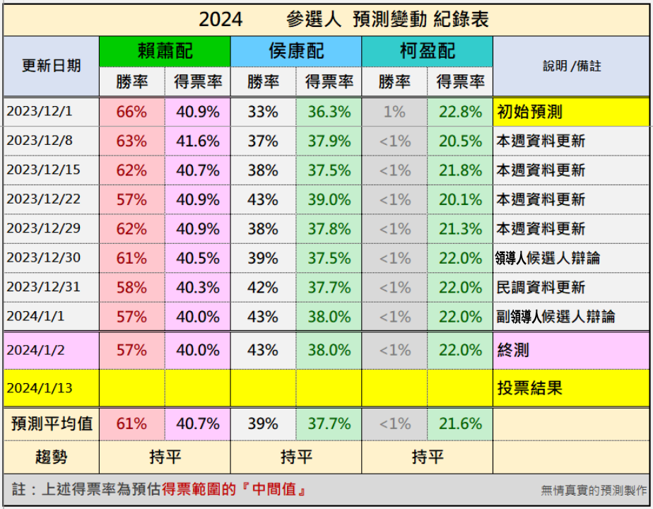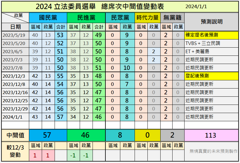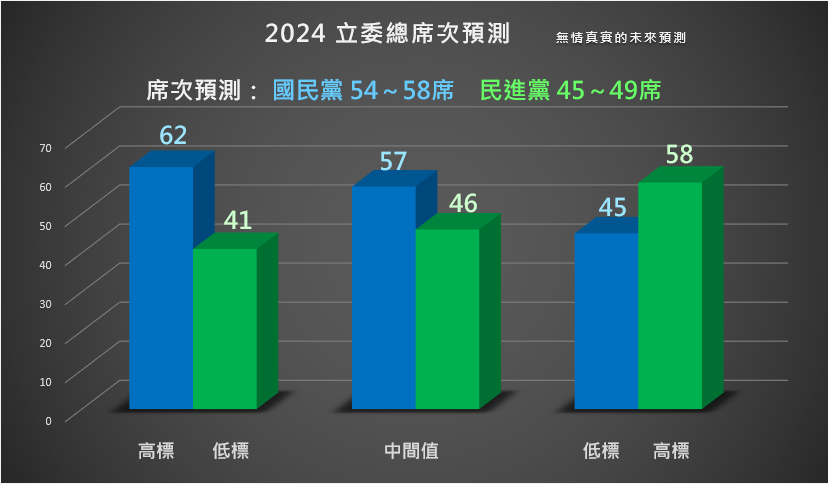 根据台湾民调网站“无情真实的未来预测”(曾准确预测2016和2020两次选举)今年1月2日最新民调数据,目前“赖萧配”和“侯康配”的差距仍在“机会均等”的范围内,在“立法院”层面国民党预计能获得57个“立委”席位。