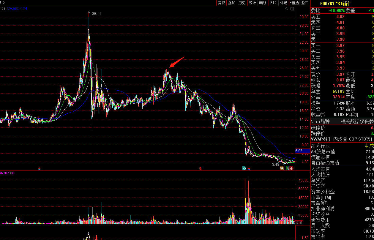 2017年8月份至今公司最高120多亿市值跌到了24亿,由原来的辅仁药业变更为*ST辅仁,实际控股人朱文臣被执行21条限制消费令。